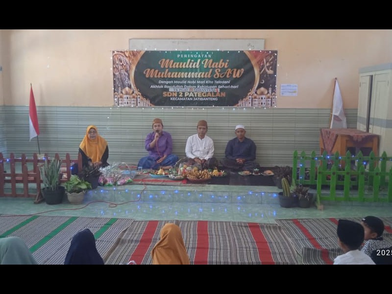 Dalam rangka memperingati Maulid Nabi Muhammad SAW, SD Negeri 2 Pategalan mengadakan acara keagamaan yang berlangsung khidmat pada hari Selasa, 16 September 2025. Kegiatan ini dilaksanakan di halaman sekolah dan diikuti oleh seluruh siswa, guru, serta wali murid. Acara dipandu oleh pembawa acara, Bapak Masykur Imam, S.Pd, yang membuka kegiatan dengan semangat dan penuh antusiasme. Sebelum memasuki acara inti, rangkaian pra-acara turut memeriahkan suasana, antara lain penampilan tari-tarian islami, pembacaan puisi bertema keteladanan Rasulullah, dan pidato religi yang dibawakan oleh siswa-siswi SDN 2 Pategalan.